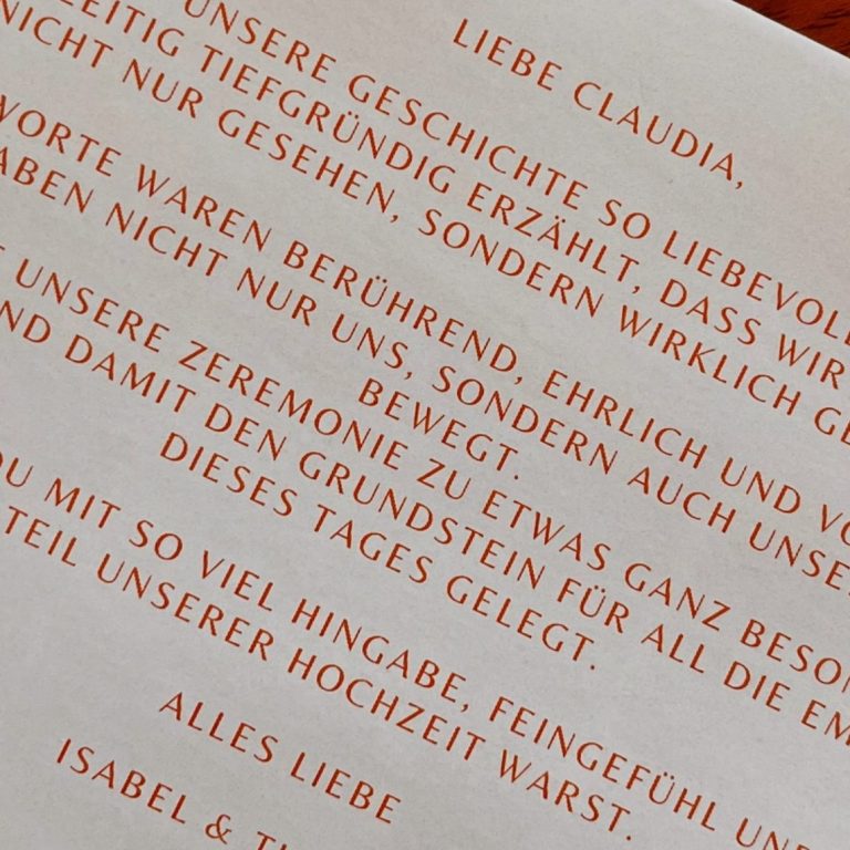"Wir möchten uns von ganzem Herzen bei dir für deine wundervolle Rede bedanken du hast die perfekten Worte gefunden und wir waren so gerührt. Aber nicht nur von deiner Rede sondern vor allem auch von deiner so herzlichen Art . Wir sind unendlich dankbar, dass wir dich an unserer Seite hatten an unserem Tag. Die Hochzeit war ein absoluter Traumfür uns und wir sind überglücklich, dass sich die viele Arbeit und Planung gelohnt hat. Unsere Familien und Freunde waren auch mehr als begeistert.“